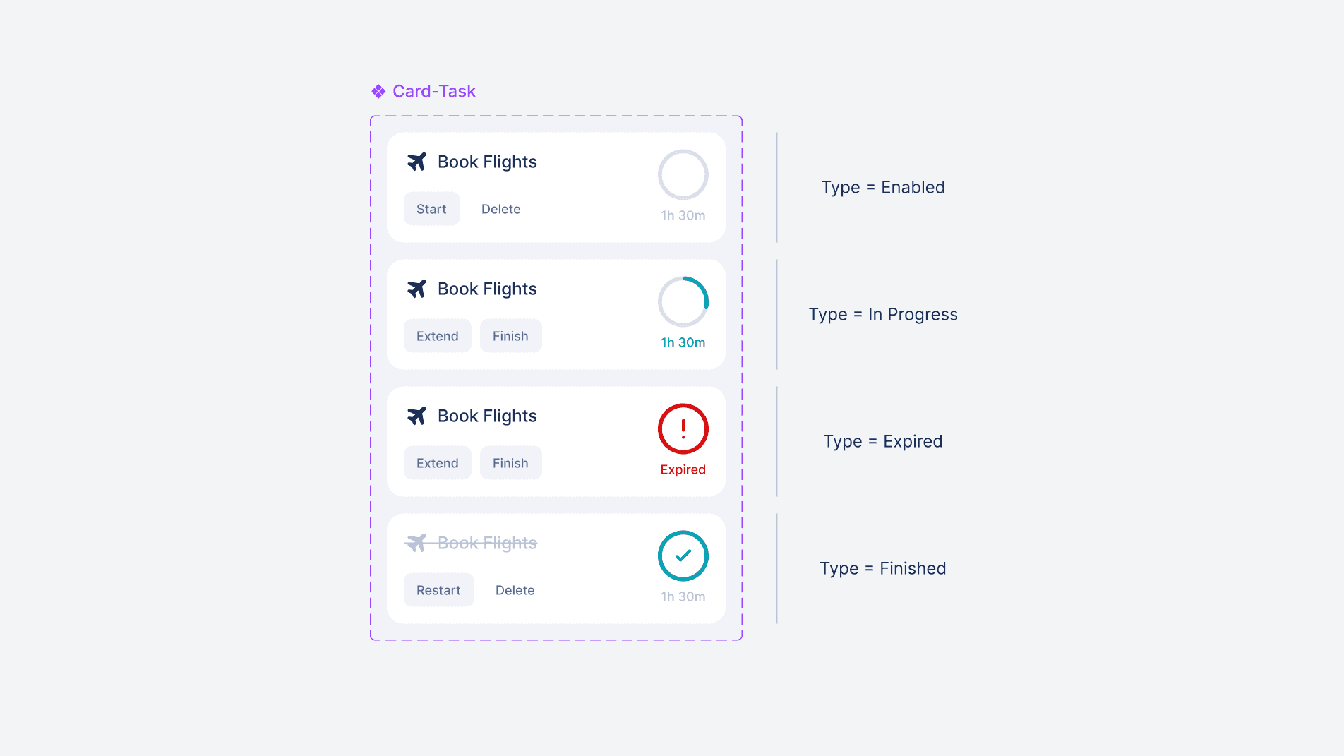 I designed a "utility-first" Master Task Card featuring clear action buttons tailored to specific task states (e.g., Start/Delete or Restart/Delete). I integrated high-contrast status icons and countdown timers for real-time feedback, using these components to form the atoms of a new design system.